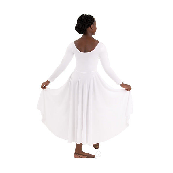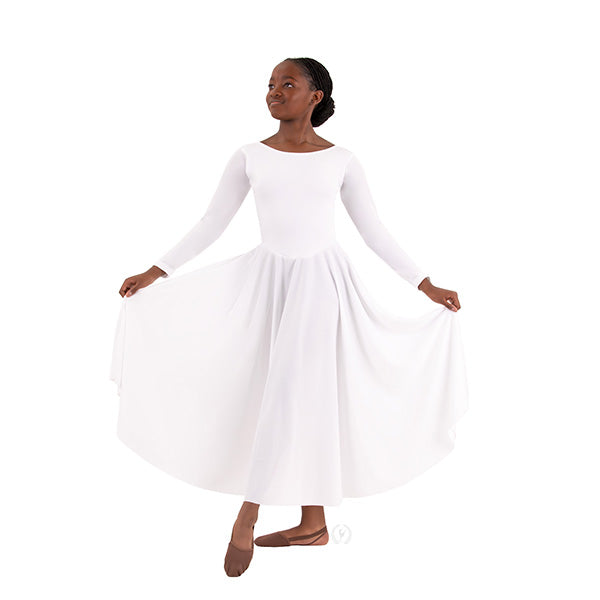This youth praise dance dress is an essential liturgical style for praise teams, worship groups, and dance ministries due to its versatility. Features include a modest scoop neck, long sleeves, and a front lined bodice. The 'V' shaped waist fits and flatters, making this style a popular concert dress for choir groups and liturgical uniform for dance ministries.