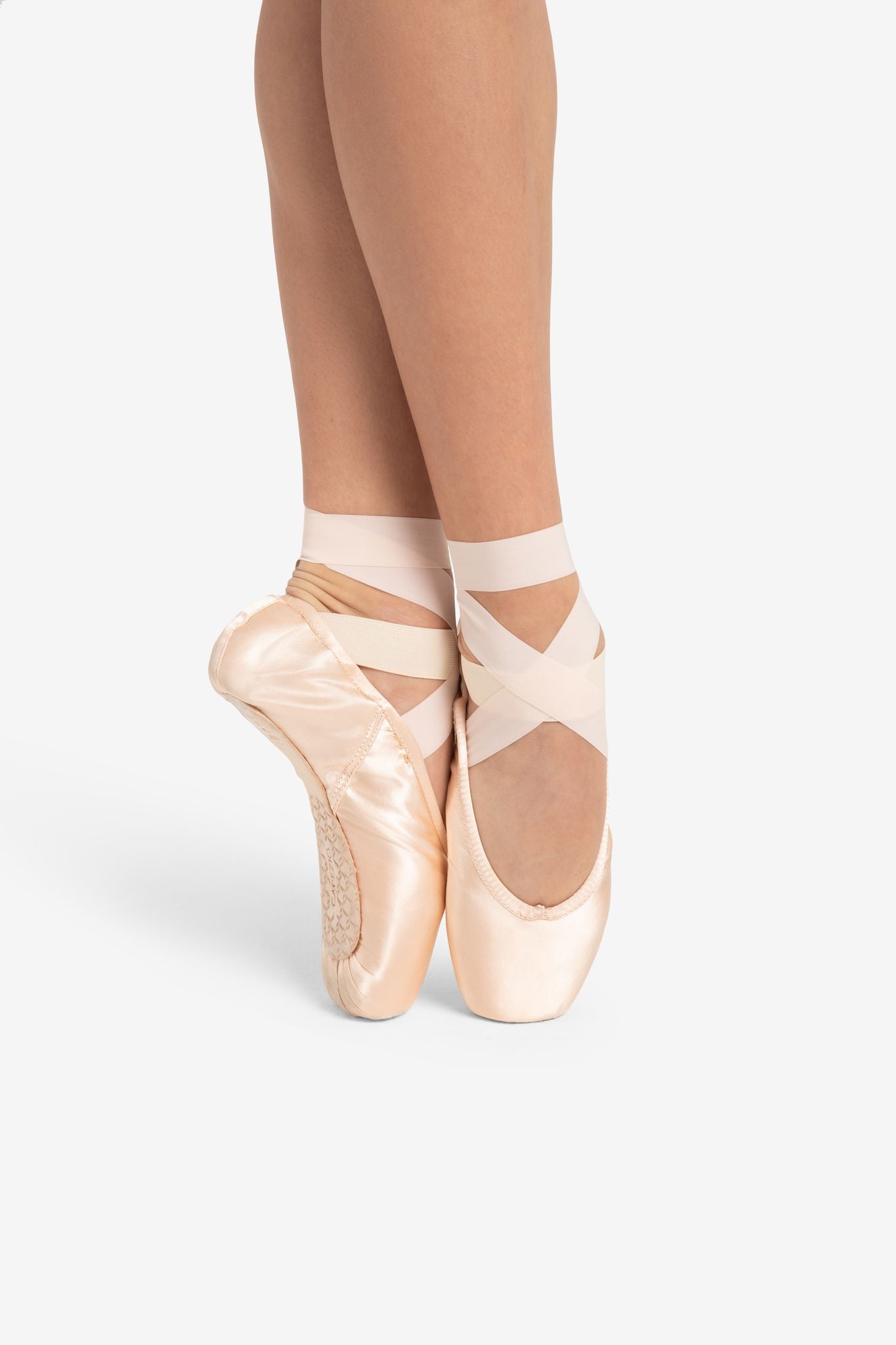 Arabesque like a professional in the Ava Pointe Shoe. This premium pointe shoe has a broad, feathered toe box and a combination, full 2.5" leather board and red board shank that offers flexibility to the arch. Features a high and wide platform for much needed balance at the barre. Removable medical grade gel cushion is placed on the internal edge of the platform for added comfort. Ideal for a broad (Roman) foot. Pro Tip: When attaching Bunheads® ribbons and elastics to pointe shoes that have rose colored lining, a medium needle with a small eye works best. Suggested Fitting: For first time pointe shoe shoppers, we recommend a professional fitting at your nearest Capezio retail store.