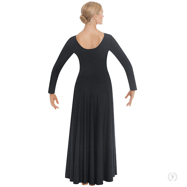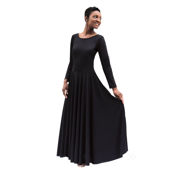 Eurotard's praise dance dress for women is an essential style for praise dancers, praise teams, and dance ministries. Suitable for all year long, any season, and any occasion. Features include a modest scoop neck, long sleeves, and front lined bodice. The 'V' shaped waist fits and flatters, making this style a popular praise garment for dance ministries as well as a concert dress for choir groups.