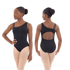 Microfiber leotard with asymmetrical tank strap on left shoulder, complemented by double camisole straps on the right. Full front, antimicrobial lining and open keyhole back detail.