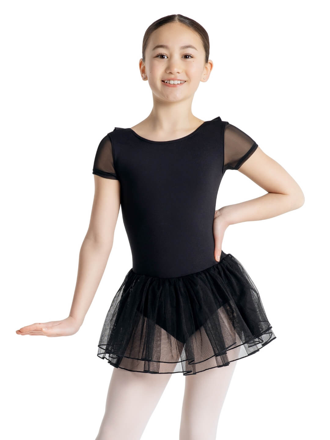 Shine like the brightest star in the sky in the Polaris Tutu Dress! Attached, double layer tulle tutu adds elegance to every move. High front neckline with a deep, open v-back. Ruffle-lined necklines for subtle detail. Mesh cap sleeves for comfort and breathability. Finished edges on the skirt for a polished look. Available in child sizes only.