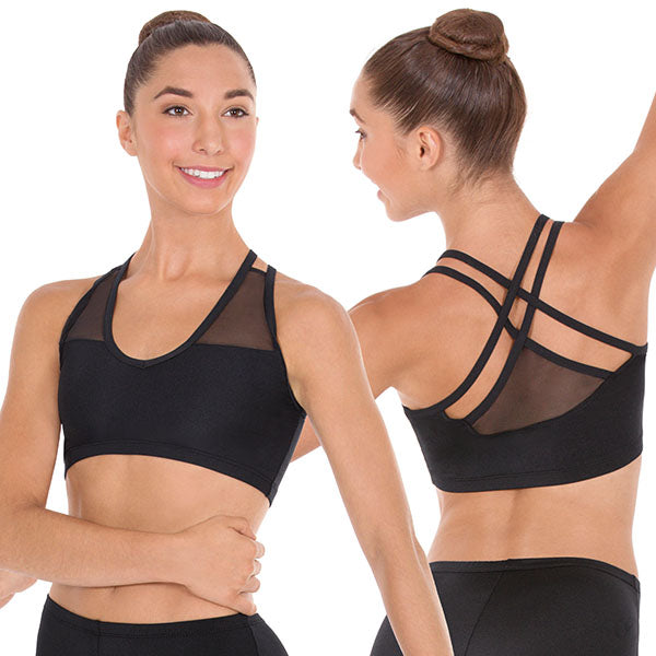 Perfect for wearing with shorts or layering underneath your favorite leotard! The fabric has a slight trendy sheen, and the mesh insert in the back adds just the right amount of stylistic surprise. This crop is double lined for coverage and confidence. Try it in a bold, luminous jewel tone or pair it with our high waist fashion shorts!