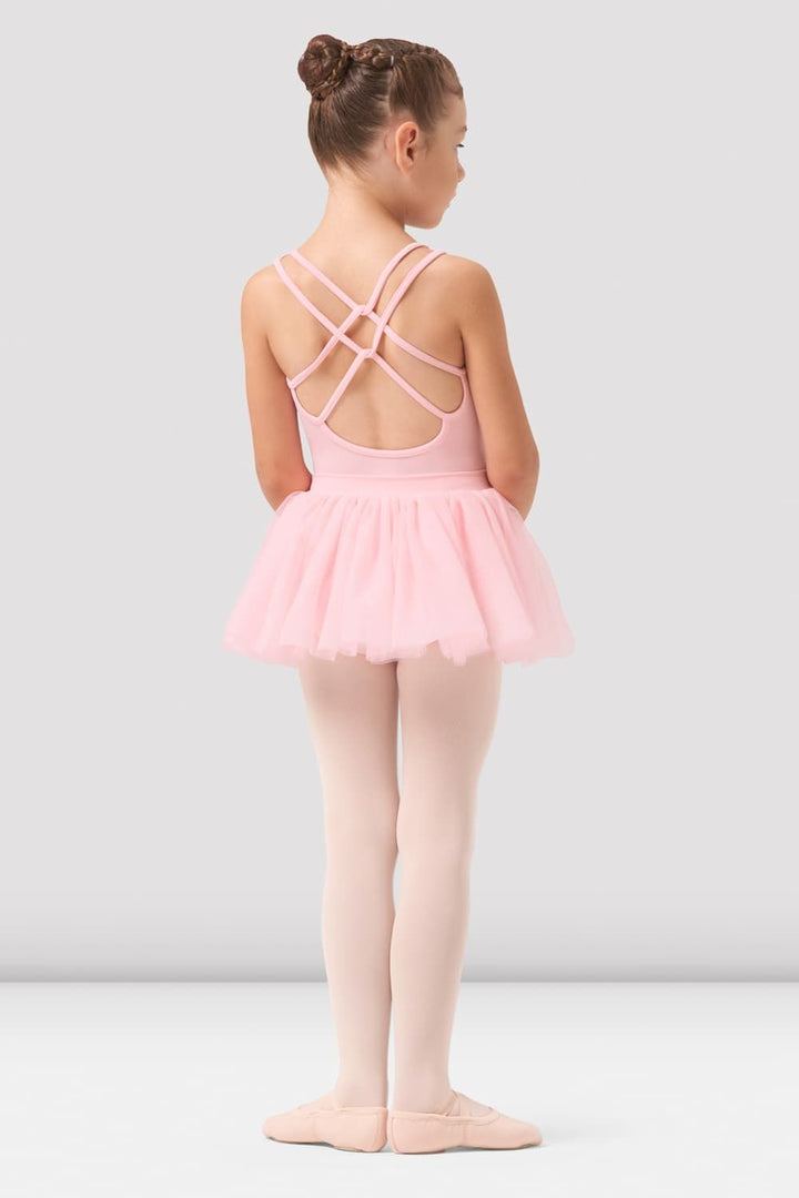 Our Girls Leila Cross Back Tutu Dress features tank straps with a double crossover back detail and attached tulle tutu skirt. Part of our Girls Bloch Rose Vine Collection featuring exquisite flocked floral detailing and delicate mesh panels. This darling collection offers a variety of styles suitable for any budding ballerina in three classical tones.