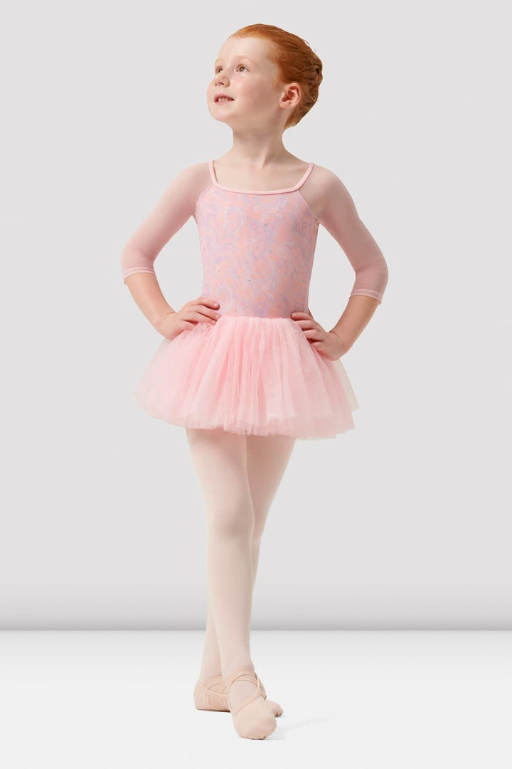 Our Girls Mirella Paisley 3/4 Sleeve Tutu Dress features a paisley printed bodice with mesh 3/4 length sleeves and an attached tulle tutu skirt. Part of our Girls Mirella Paisley Petite Collection featuring delicate paisley printed mesh and contemporary back detailing. This collection's styles are both cute and comfortable, available in four pastel colorways.