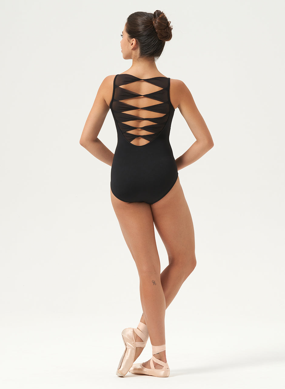 Our Ladies Mirella Boheme Boat Neck Leotard features a boat neck with camisole straps and multiple twist mesh back details. Part of our Mirella La Bohéme Collection featuring intricate paisley prints, rouleau details and contemporary back designs. This collection highlights a variety of standout silhouettes, available in a trio of muted hues.